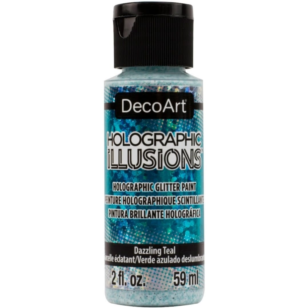 Dies ist keine gewöhnliche Glitterfarbe. DecoArt Holographic Illusions verleiht Projekten die Magie einer echten holografischen Glitzerfarbe mit einem lichtbrechenden Regenbogen aus kräftigen Farben. Diese holografischen Glitterflocken sorgen für ein prismisches Funkeln und Glänzen. Die Farbe trocknet klar ab.