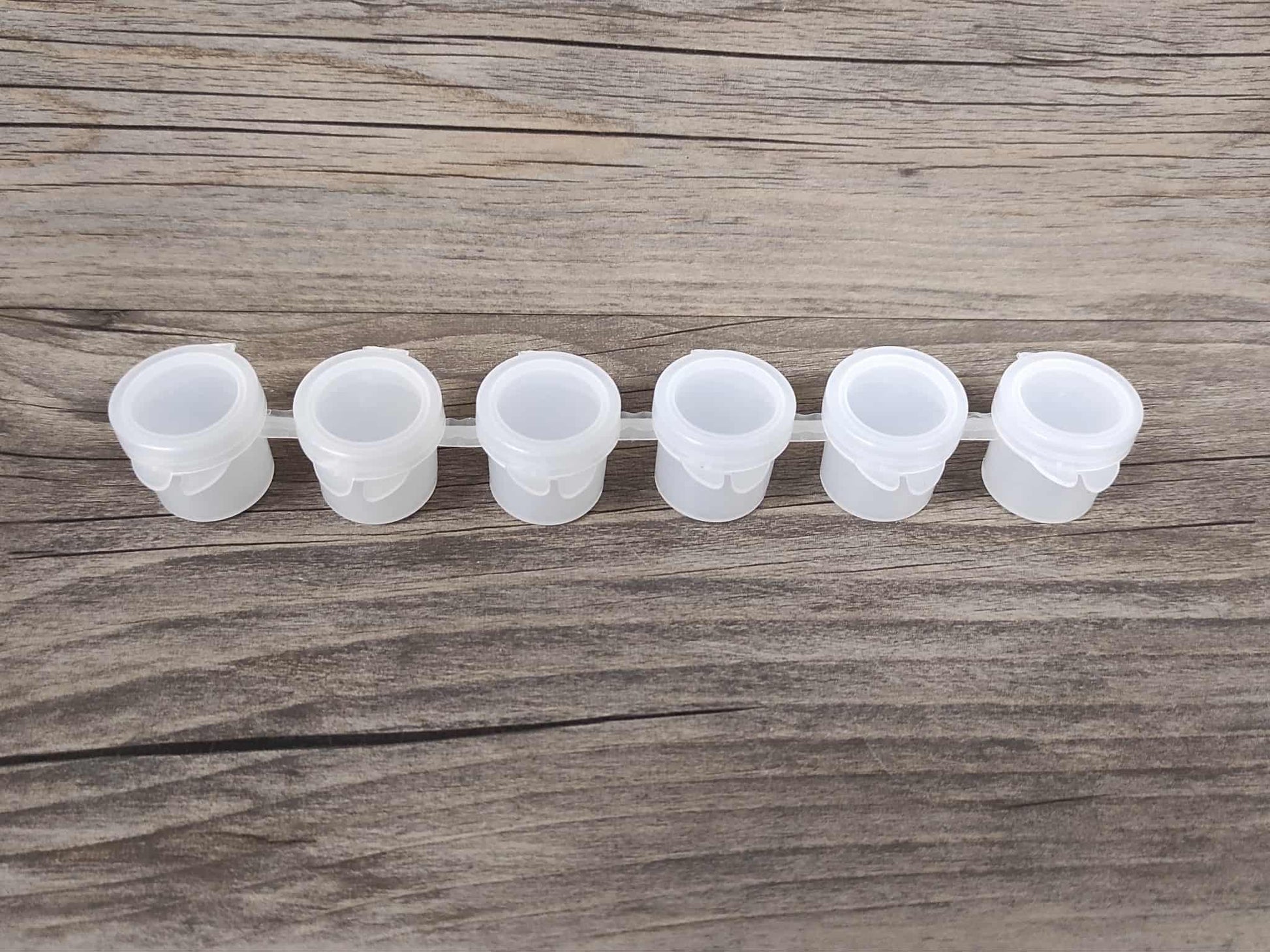 6 kleine Farbtöpfchen mit je 5ml, 10ml oder 30ml Volumen.