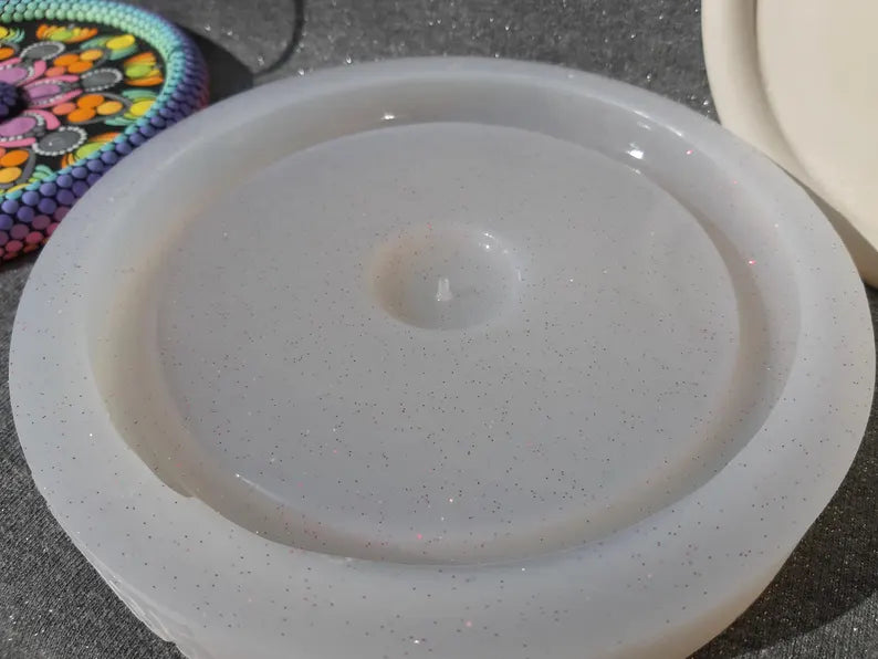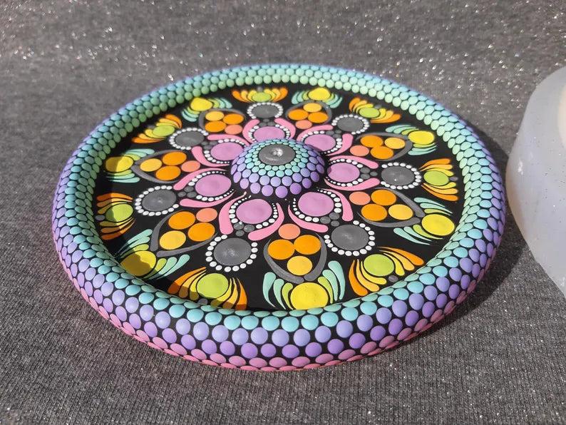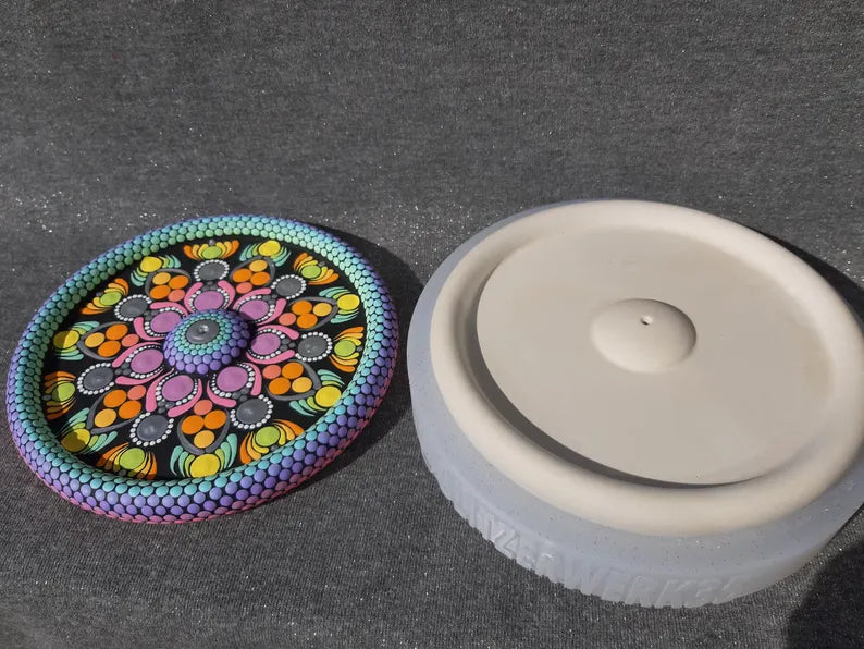 Aus der Silikonform entsteht ein Räucherstäbchenhalter mit ca. 16 cm Durchmesser und ca. 2,2 cm Höhe für Handelsübliche Räucherstäbchen