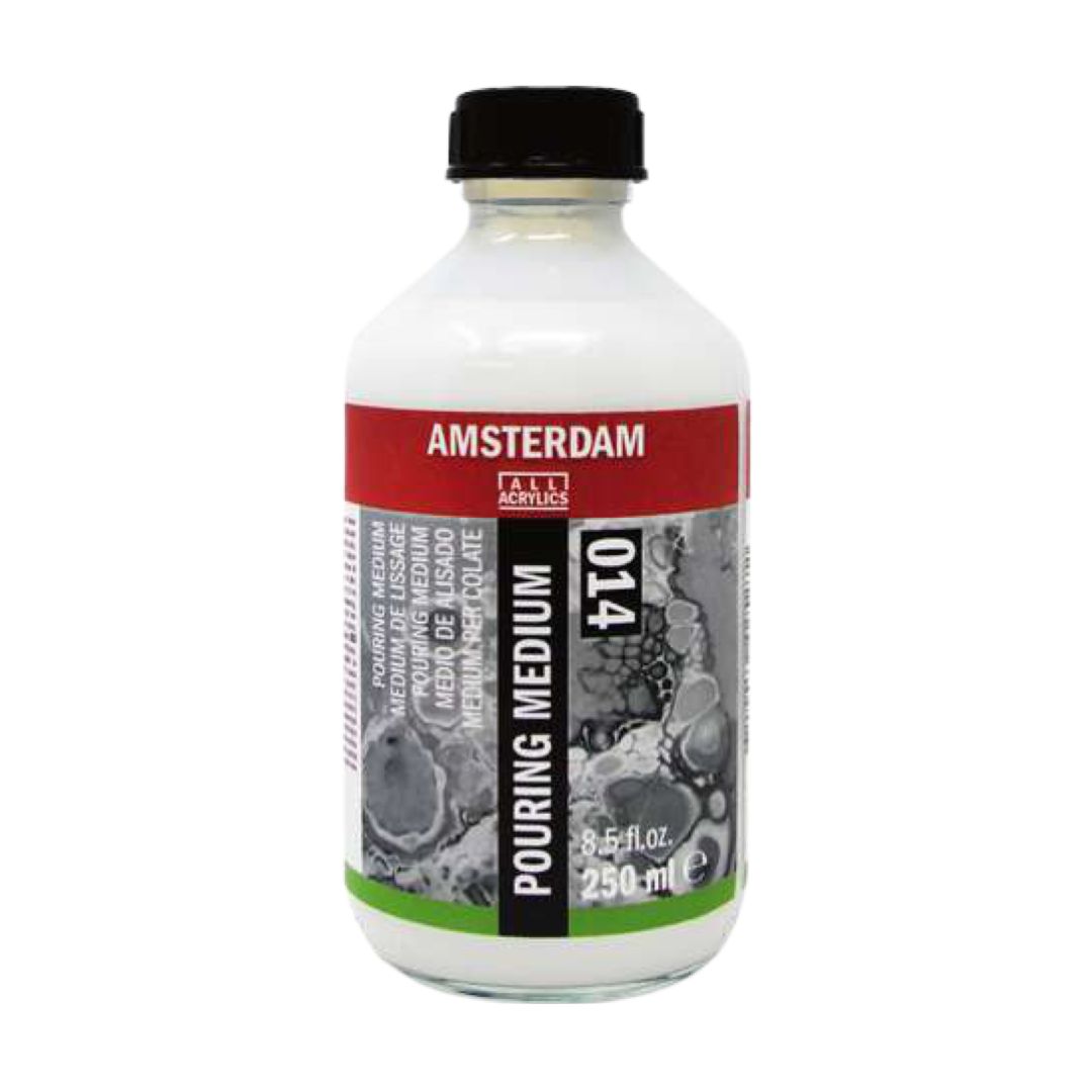 Amsterdam Pouring Medium 014 is a liquid acrylic medium for pouring applications. Dries colorless, transparent, flexible and waterproof with a high degree of gloss.