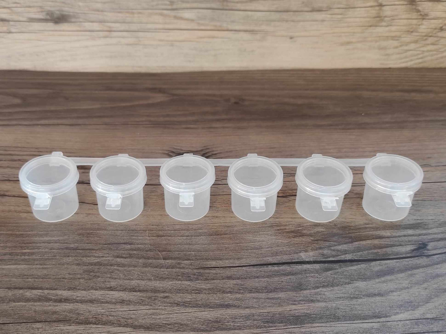 6 kleine Farbtöpfchen mit je 5ml, 10ml oder 30ml Volumen.